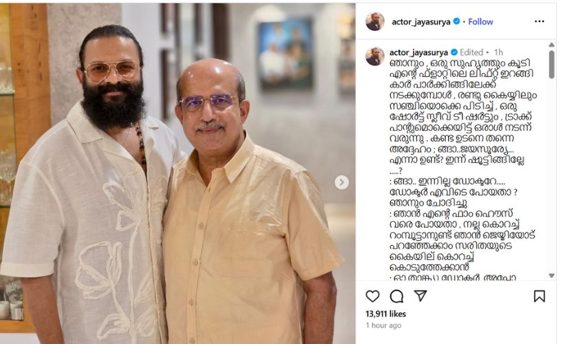 ഡോ. ജോസ് ചാക്കോ പെരിയപ്പുറത്തെ ഹൃദ്യമായ കുറിപ്പ് പങ്കുവെച്ച് നടൻ ജയസൂര്യ. നടനും ഒരു സുഹൃത്തും കൂടി ഫ്ളാറ്റിലെ ലിഫ്റ്റ് ഇറങ്ങി കാർ പാർക്കിങ്ങിലേക്ക് നടക്കുമ്പോഴാണ് രണ്ടു കൈയ്യിലും സഞ്ചിയുമായി ഒരു ഷോർട്ട് സ്ലീവ് ടീ ഷർട്ടും ട്രാക്ക് പാൻ്റുമിട്ട് എതിരെ നടന്നുവരുന്ന ഡോ. ജോസ് ചാക്കോ പെരിയപ്പുറത്തെ കാണുന്നത്. ഇരുവരും തമ്മിലുള്ള കുശലാന്വേഷണങ്ങൾക്ക് ശേഷം സുഹൃത്തിനോട്