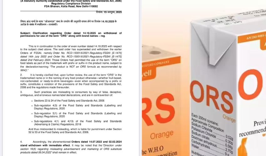 പഴങ്ങൾ അടിസ്ഥാനമാക്കിയുള്ള പാനീയങ്ങൾ, എനർജി ഡ്രിങ്കുകൾ, റെഡി-ടു-സെർവ് പാനീയങ്ങൾ, ഇലക്ട്രോലൈറ്റ് പാനീയങ്ങൾ എന്നിവയിൽ വ്യപകമായി ‘ORS’ (ഓറൽ റീഹൈഡ്രേഷൻ സൊല്യൂഷൻ) എന്ന പദം പേരിലോ ലേബലിലോ അല്ലെങ്കിൽ ബ്രാൻഡ് ലോഗോയിലോ ഉപയോഗിക്കുന്നുണ്ട്. അംഗീകരിക്കപ്പെട്ട കൃത്യമായ ഫോർമുല ഉപയോഗിച്ച് നിർമിക്കാത്ത ഇത്തരം ഉത്പന്നങ്ങൾ വിപണിയിൽ നിന്ന് നീക്കം ചെയ്യുന്നതായി ഫുഡ് സേഫ്റ്റി ആൻഡ് സ്റ്റാൻഡേർഡ്സ് അതോറിറ്റി ഓഫ് ഇന്ത്യ (FSSAI) ഉത്തരവ് പുറപ്പെടുവിച്ചു.