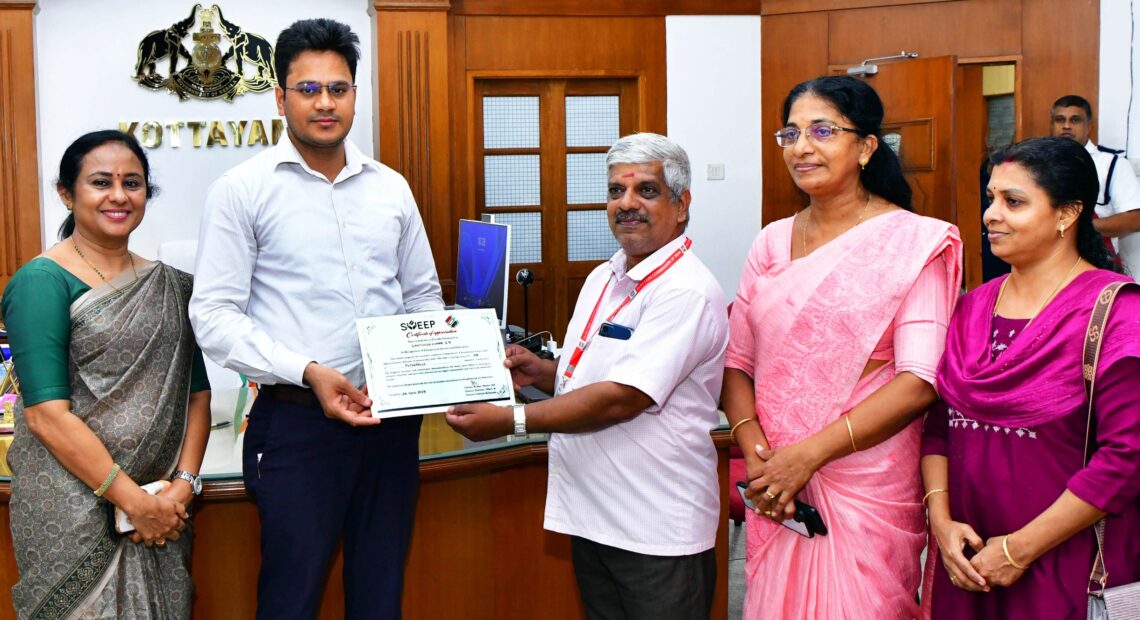കോട്ടയം: പ്രത്യേക തീവ്ര വോട്ടര് പട്ടിക പരിഷ്കകരണവുമായി ബന്ധപ്പെട്ട എന്യുമേറേഷന് നടപടികള് ജില്ലയില് ആദ്യമായി പൂര്ത്തീകരിച്ച ബൂത്ത് ലെവല് ഓഫീസര്ക്ക് ജില്ലാ തെരഞ്ഞെടുപ്പ് ഓഫീസറുടെ ആദരം. പുതുപ്പള്ളി നിയമസഭാ മണ്ധലത്തിലെ 56-ാം പോളിംഗ് ബൂത്തിലെ ബി.എല്.ഒ എസ്.ആര്. സന്തോഷ് കുമാറാണ് എന്യുമറേഷന് ഫോമുകളുടെ വിതരണവും ഡിജിറ്റൈസേഷനും ആദ്യമായി പൂര്ത്തിയാക്കിയത്.