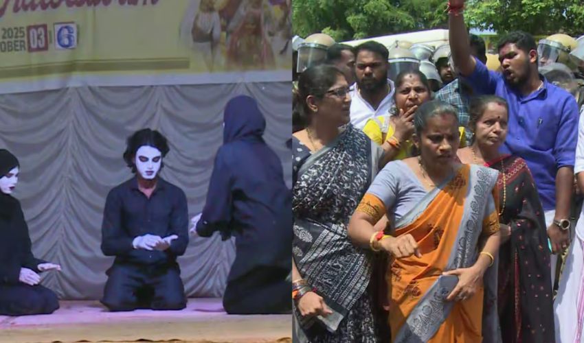 കാസർകോട്: സ്കൂൾ കലോത്സവത്തിന്റെ ഭാഗമായി നടത്തിയ മൈം മത്സരത്തിൽ പലസ്തീൻ ഐക്യദാർഢ്യ മൈം വീണ്ടും അവതരിപ്പിച്ചു. കഴിഞ്ഞ ദിവസം കുമ്പള ഗവൺമെന്റ് ഹയർ സെക്കൻഡറി സ്കൂളിൽ മൈം അവതരിപ്പിക്കുന്നതിനിടയിൽ അധ്യാപകർ കർട്ടൻ ഇട്ട് നിർത്തി വയ്പ്പിച്ച മൈമാണ് വിദ്യാർത്ഥികൾ വീണ്ടും അവതരിപ്പിച്ചത്. പത്ത് മിനിറ്റ് ദൈർഘ്യമുണ്ടായിരുന്ന മൈം കലോത്സവത്തിന്റെ മാന്വൽ പ്രകാരം അഞ്ച് മിനിറ്റായി