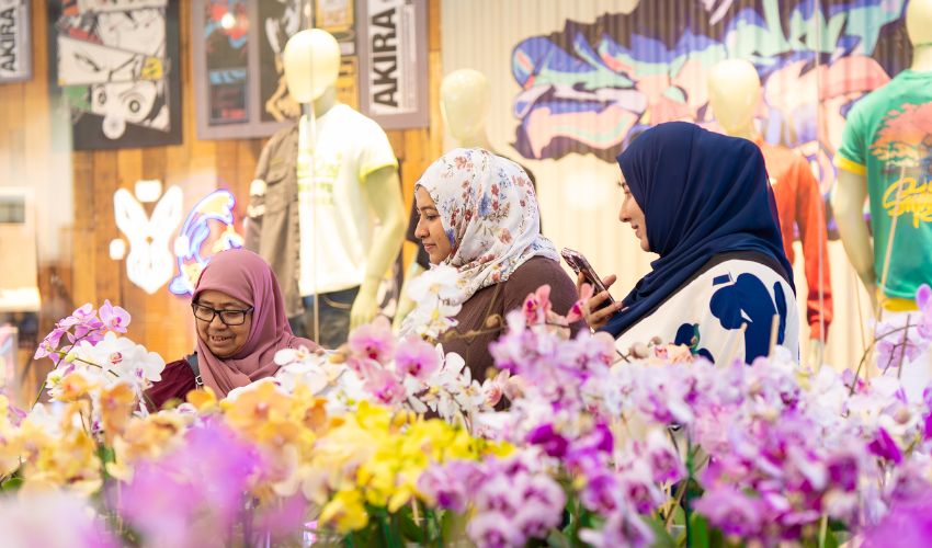 ലുലു ഫ്ലവർ ഫെസ്റ്റിന്റെ ഭാഗമായി മാളിൽ ഒരുക്കിയ സ്റ്റാൾ വീക്ഷിക്കുന്ന ഇന്തോനേഷ്യൻ വനിതകൾ.
